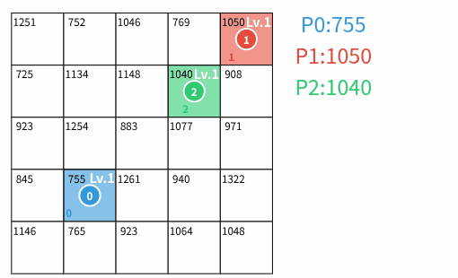 各マス $ (i,j) $ は**価値** $ V_{i,j} $ と**レベル** $ L_{i,j} $ を持つ。 価値はゲームの進行によらず不変であり、レベルはゲームの進行に応じて変化する値である。 初期状態において、各プレイヤーの初期領土のレベルは $ 1 $ であり、誰の領土でもないマスのレベルは $ 0 $ である。