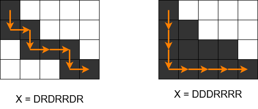 2. Stand on cell $ (1,1) $ . Then for $ i=1,2,\ldots $ in order, move one cell in the direction indicated by $ X_i $ : if $ X_i $ is `D`, move down one cell; if $ X_i $ is `R`, move right one cell. It can be shown that if $ X $ satisfies the conditions in step 1, the destination cell always exists within the grid.