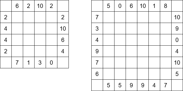 每个好格子上写有一个整数。这些信息通过长度为 $N-2$ 的四个整数数列给出:$U=(U_1,\ldots,U_{N-2})$、$D=(D_1,\ldots,D_{N-2})$、$L=(L_1,\ldots,L_{N-2})$、$R=(R_1,\ldots,R_{N-2})$。