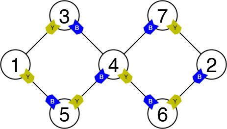 ### 样例解释 1 此处指示牌的放置方式如图所示。例如,从顶点 $3$ 出发: - 遵循蓝色指示牌前进,路径为 $3\rightarrow 4\rightarrow 5\rightarrow 1$,最终到达顶点 $1$。 - 遵循黄色指示牌前进,路径为 $3\rightarrow 1\rightarrow 5\rightarrow 4\rightarrow 6\rightarrow 2$,最终到达顶点 $2$。 同样可以验证,从顶点 $2$ 遵循蓝色指示牌也可以到达 $1$,从顶点 $1$ 遵循黄色指示牌也可以到达 $2$,其他顶点也都满足条件。 ![](https://cdn.luogu.com.cn/upload/vjudge_pic/AT_arc211_d/94f075830cda0a3e14bdd1f8ffb2f42bd89d75bdce751ea5660ad6173b882f00.png) 虽然存在多种方案,但例如顶点 $3$ 上的蓝色指示牌和黄色指示牌都不能指向顶点 $4$,因为同一顶点两个指示牌不允许指向同一个顶点。 ### 样例解释 2 不存在满足条件的指示牌放置方式。 ### 约束条件 - $2\leq N\leq 2\times 10^5$ - $1\leq M\leq 3\times 10^5$ - $1\leq U_i < V_i\leq N$ 且 $1\leq i\leq M$ - 给定图保证简单且连通。 - 所有输入都是整数。 由 ChatGPT 5 翻译
