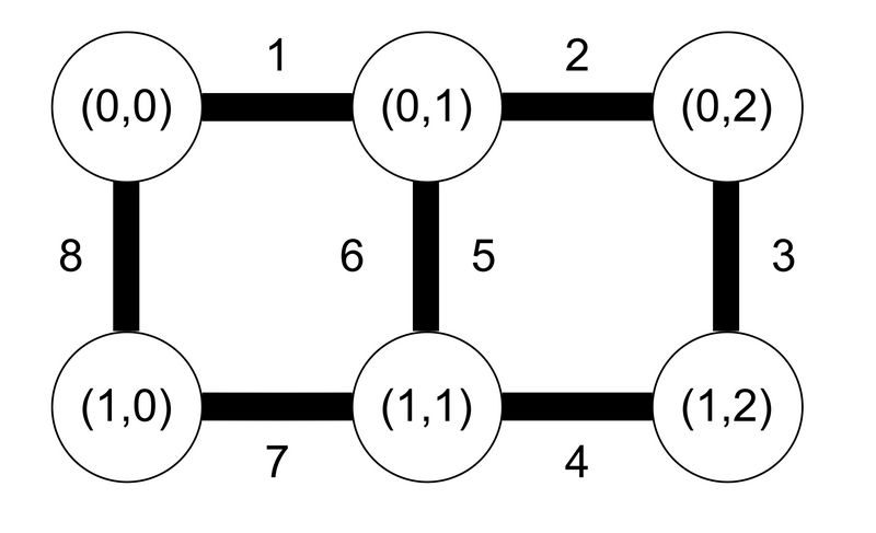 例如,可以如下图依次编号的通道移动,从舞台 $(0,0)$ 出发,只需移动 8 次即可经过所有通道。