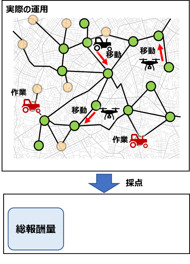 [problemUrl]: https://atcoder.jp/contests/hokudai-hitachi2022/tasks/hokudai_hitachi2022_a 本题要求在农机共享服务中,最大限度地利用所拥有的机械和人员(以下简称“工人”),以获得最多的报酬来完成农作业(以下简称“作业”)。你需要指挥工人移动和作业,处理分布在空间中的大量作业。每个作业由多个小作业“任务”组成,工人需要按规定数量完成这些任务,作业才算完成。完成作业可以获得报酬,但任务处理的时间会影响报酬,因此需要考虑合适的作业时段。此外,每个时刻工人能执行的任务数取决于其处理能力。 *报酬:假设与农作物的适宜收获期、纳米电网向农机供能的可再生能源利用率等相关。 ![](https://img.atcoder.jp/hokudai-hitachi2022/ffbe45bdd4d63e56094c790802bb27a7.png) ![](https://cdn.luogu.com.cn/upload/vjudge_pic/AT_hokudai_hitachi2022_a/de4d31aa4d55b3b9f43c77fec86a514a4da4e02e.png) 输入首先给出以下信息: 1. 作业期间 2. 地理信息(图) 3. 工人信息 4. 所有作业信息 你需要输出: 1. 作业期间内每个时刻所有工人的行动 通过作业获得的报酬总和即为得分。 以下为详细说明。 ##