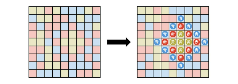 取 $r=1$,$(x, y) = (2, 2)$,$c_0$ 选蓝色,$c_1$ 选黄色时,可以如下种植 5 朵花。背景色表示每个区块可种植的花色。