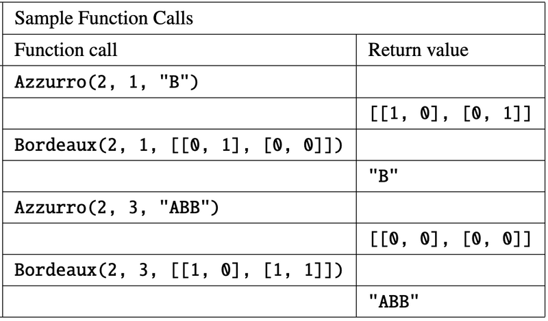 - Your program can implement other functions for internal use, or use global variables. Submitted files will be compiled with the grader, and become a single executable file. All global variables and internal functions should be declared in an unnamed namespace to avoid confliction with other files. When it is graded, it will be executed as two processes of Azzurro and Bordeaux. The process of Azzurro and the process of Bordeaux cannot share global variables.