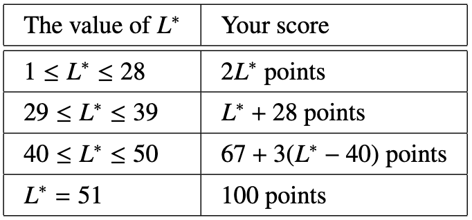 Otherwise, let $ L^{*} $ be the minimum of the following values for all test cases of this task. Your score is calculated as in the following table.