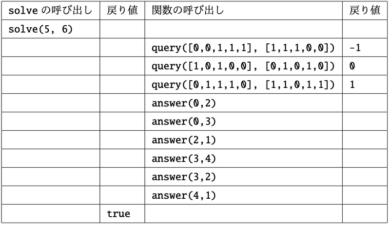 ### 実装の詳細 あなたの回答プログラムは,`voltage.h` を `#include` プリプロセッサ指令で読み込み,以下の関数を実装しなければならない. - `bool solve(int N, int M)` - この関数は $ 1 $ 回の実行で $ 1 $ 回だけ呼び出される. - 引数 `N` は 回路の節点の数 $ N $ である. - 引数 `M` は 回路の電気抵抗の本数 $ M $ である. - この関数は,いかなる温度の比較を何回行ったとしても電気抵抗の繋がりを一意に特定できない場合には `false` を,それ以外の場合には `true` を返さなければならない. - 電気抵抗の繋がりを特定不能であるのに `true` を返した場合,**不正解\[1\]** と判定される. - 温度の比較によって回路が特定できるのに `false` を返した場合,**不正解\[2\]** と判定される. あなたのプログラムは以下の関数を呼び出すことができる. - `int query(std::vector x, std::vector y)` - あなたはこの関数を用いて電圧の設定を $ 2 $ 回行い,温度を比較できる. - 引数 `x` は $ 1 $ 回目の電圧の設定を,引数 `y` は $ 2 $ 回目の電圧の設定を指定する. - 引数 `x` と `y` は $ 0 $ と $ 1 $ からなる長さ $ N $ の配列でなければならない. - `x[k]` ( $ 0 \leqq k \leqq N - 1 $ ) が $ 1 $ ならば $ 1 $ 回目の電圧の設定において,節点 $ k $ は「高電圧」に, `x[k]` が $ 0 $ ならば節点 $ k $ は「低電圧」に設定することを表す. - `y[k]` ( $ 0 \leqq k \leqq N - 1 $ ) が $ 1 $ ならば $ 2 $ 回目の電圧の設定において,節点 $ k $ は「高電圧」に, `y[k]` が $ 0 $ ならば節点 $ k $ は「低電圧」に設定することを表す. - この関数の戻り値は $ 1 $ 回目の電圧の設定と $ 2 $ 回目の電圧の設定において,温度を比較した結果であり, $ -1,0,1 $ のいずれかの値である. - 戻り値が $ -1 $ のとき, $ 1 $ 回目の方が, $ 2 $ 回目の電圧の設定より,電流が流れる電気抵抗の本数が多いことを表す. - 戻り値が $ 0 $ のとき, $ 1 $ 回目と $ 2 $ 回目の電圧の設定において電流が流れる電気抵抗の本数が等しいことを表す. - 戻り値が $ 1 $ のとき, $ 2 $ 回目の方が, $ 1 $ 回目の電圧の設定より,電流が流れる電気抵抗の本数が多いことを表す. - 引数 `x` の長さが $ N $ でない場合,**不正解\[3\]** と判定される. - 引数 `x` に $ 0 $ でも $ 1 $ でもない値が含まれる場合,**不正解\[4\]** と判定される. - 引数 `y` の長さが $ N $ でない場合,**不正解\[5\]** と判定される. - 引数 `y` に $ 0 $ でも $ 1 $ でもない値が含まれる場合,**不正解\[6\]** と判定される. - この関数を $ 30\,000 $ 回より多く呼び出してはならない. $ 30\,000 $ 回より多く呼び出した場合,**不正解\[7\]** と判定される. - `void answer(int a, int b)` - この関数を用いて,特定した電気抵抗を解答する. - 引数 `a`, `b` は節点 $ a $ から節点 $ b $ に向けて繋がれている電気抵抗があることを表す. - $ 0 \leqq a \leqq N - 1 $ かつ $ 0 \leqq b \leqq N - 1 $ でなければならない.これが満たされない場合 **不正解\[8\]** と判定される. - 同じ $ (a, b) $ の組を引数として $ 2 $ 回以上呼び出してはならない.これが満たされない場合 **不正解\[9\]** と判定される. - この関数を $ M $ 回より多く呼び出してはならない. $ M $ 回より多く呼び出した場合,**不正解\[10\]** と判定される. - 関数 `solve` が `true` を返したとき,それまでに関数 `answer` はちょうど $ M $ 回呼び出されている必要がある. これが満たされない場合,**不正解\[11\]** と判定される. - 関数 `solve` が `true` を返したとき,それまでに関数 `answer` の引数として渡されたすべての組 $ (a, b) $ について,節点 $ a $ から節点 $ b $ へ向けて繋がれている電気抵抗が実際に存在していなければならない. これが満たされない場合,**不正解\[12\]** と判定される. #### 重要な注意 - 内部での使用のために他の関数を実装したり,グローバル変数を宣言するのは自由である. - あなたの提出したプログラムは,標準入力・標準出力,あるいは他のファイルといかなる方法でもやりとりしてはならない. ただし,標準エラー出力にデバッグ情報等を出力することは許される. ### コンパイル・実行の方法 作成したプログラムをテストするための,採点プログラムのサンプルが, コンテストサイトからダウンロードできるアーカイブの中に含まれている. このアーカイブには,提出しなければならないファイルのサンプルも含まれている. 採点プログラムのサンプルは $ 1 $ つのファイルからなる. そのファイルは `grader.cpp` である. 作成したプログラムをテストするには, これらのファイル `grader.cpp`, `voltage.cpp`, `voltage.h` を同じディレクトリに置き,次のようにコマンドを実行する. ``` g++ -std=gnu++20 -O2 -o grader grader.cpp voltage.cpp ``` なお,アーカイブの中に含まれている `compile.sh` というファイルを代わりに実行してもよい.その場合,次のようにコマンドを実行する. ``` ./compile.sh ``` コンパイルが成功すれば,`grader` という実行ファイルが生成される. 実際の採点プログラムは,採点プログラムのサンプルとは異なることに注意すること. 採点プログラムのサンプルは単一のプロセスとして起動する. このプログラムは,標準入力から入力を読み込み,標準出力に結果を出力する. #### 採点プロ