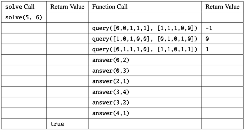 - When the function `solve` returns `true`, the function `answer` must have been called exactly $ M $ times by then. If this condition is not satisfied, your program is judged as **Wrong Answer \[11\]**.