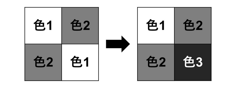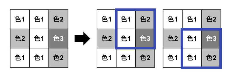 - 多彩度:在所有连续的 $2$ 行 $2$ 列的正方形区域中,包含 $3$ 种或以上不同颜色的区域的数量。