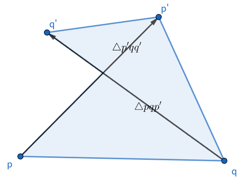 高橋くんと青木くんは、それぞれごみ袋の端を左右の手で持っており、ごみ袋の開口部は左右の手を結ぶ線分として表される。 左手の現在位置を $ p=(p_x, p_y) $ 、右手の現在位置を $ q=(q_x, q_y) $ とし、1回の操作でそれぞれを $ p'=(p_x', p_y') $ および $ q'=(q_x', q_y') $ に直線的に移動させる。 このとき、2つの三角形 $ \triangle pqp' $ および $ \triangle p'qq' $ の内部およびその境界上にあるごみは、**すべて**回収され、平面上から取り除かれる。 この操作を繰り返すことで、ごみ袋を操作してごみを回収する。