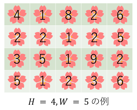 输入从标准输入给出,格式如下: > $H$ $W$ $A_{1, 1}$ $A_{1, 2}$ $A_{1, 3}$ … $A_{1, W}$ $A_{2, 1}$ $A_{2, 2}$ $A_{2, 3}$ … $A_{2, W}$ $A_{3, 1}$ $A_{3, 2}$ $A_{3, 3}$ … $A_{3, W}$ … $A_{H, 1}$ $A_{H, 2}$ $A_{H, 3}$ … $A_{H, W}$