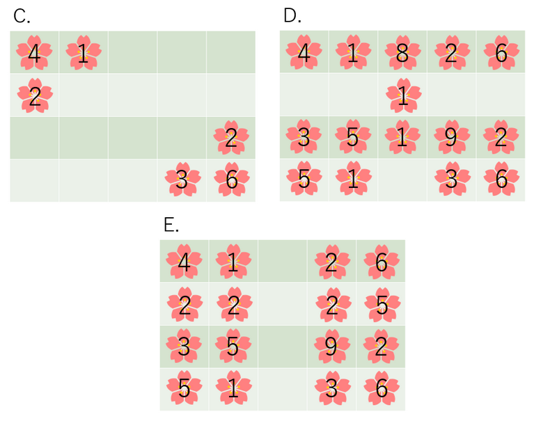 时光回到2022年6月20日。AtCoder为庆祝公司成立十周年,在总部前建造了一个花园。 这个花园能用一个 $H$ 行 $W$ 列的网格表示,每一格的位置用 $(i, j)$ 表示,$i$ 为行号,$j$ 为列号。 每个格子中种着一朵花,花在位置 $(i, j)$ 的美丽度用 $A_{i, j}$ 表示。 例如,下图展示了一个花园,其中每个格子内的数字表示花的美丽度。 ![ ](https://cdn.luogu.com.cn/upload/vjudge_pic/AT_s8pc_6_i/50e75671e8a481f76114bd53ec636486c19e89c7.png) 你的任务是砍掉一些花,让花园变得「美丽」。要称为「美丽的花园」,必须满足以下条件: - 任意两朵未被砍掉的花之间的路径唯一,且路径只能由上下左右相邻的未砍掉的花组成,并且不能经过相同的格子两次。 - 上述条件对于所有未被砍掉的花对 $(a, b)$ 和 $(c, d)$ 均成立(当 $(a, b) \neq (c, d)$)。 例如,以下是一个将花园变得美丽的砍伐方式: ![ ](https://cdn.luogu.com.cn/upload/vjudge_pic/AT_s8pc_6_i/a9967c2983cc3eab467b44c5ca2ae04d7718d334.png) 而以下的砍伐方式不能获得「美丽的花园」: ![ ](https://cdn.luogu.com.cn/upload/vjudge_pic/AT_s8pc_6_i/56e32b964babf04061bad7fc9b8687f1da210aa0.png) 「花园的得分」是所有未被砍掉的花的美丽度之和。如果花园不满足「美丽」条件,得分为 $0$。 例如,上图中的花园 $A$ 得分为 $20$,花园 $B$ 得分为 $60$,而花园 $C$、$D$、$E$ 得分均为 $0$。 请输出一种砍伐方案,使得花园得分尽可能高。