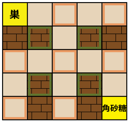 - 巢下方的一个位置 $c_{(1,0)}$ 和糖块左方的一个位置 $c_{(N-1,N-2)}$ 必为 `#`。