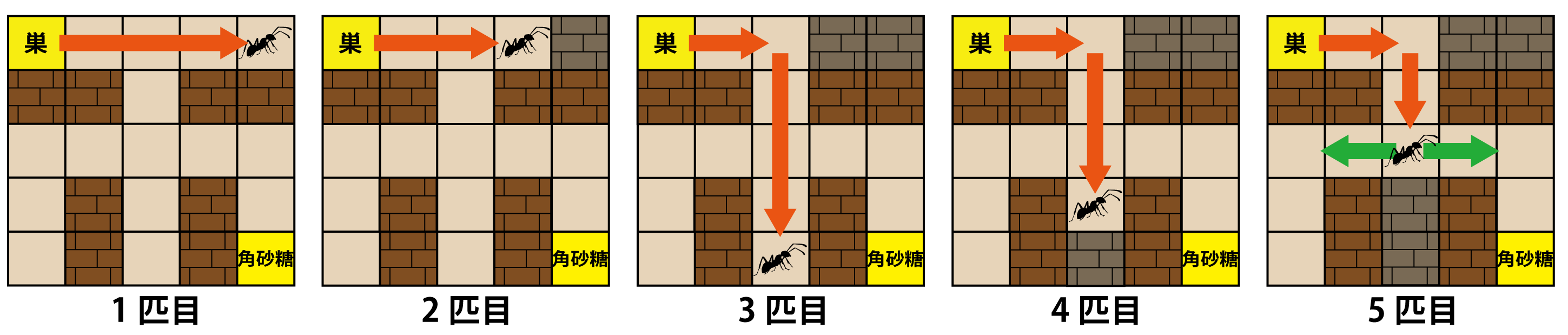 图 $2$:图 $1$ 中迷宫对前五只蚂蚁的行动记录