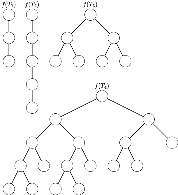 对于一棵有根树 $S$,定义 $f(S)$ 为如下操作后的有根树: - 用树 $S$ 自身替换 $S$ 的所有叶子节点。 对于有根树 $S$,定义一组无穷序列的树 $(S_1, S_2, \dots)$,具体为: - $S_1 := S$ - $S_i := f(S_{i-1}) \quad (i > 1)$ 定义无穷树 $S_{\infty}:= \displaystyle\lim_{n\to\infty} S_n$,称其为由 $S$ 导出的**分形树**(fractal tree)。 --- 给定 $K$ 棵有根树 $T_1, T_2, \dots, T_K$。每棵树 $T_i\,(i=1,2,\dots,K)$ 满足以下条件: - 顶点数为 $N_i \geq 2$ - 顶点依次编号为 $1,2,\dots,N_i$ - 根为编号 $1$ 的顶点 - 对于 $j=2,3,\dots,N_i$,顶点 $j$ 的父节点为 $p_{i,j}$ 请对于每一对 $(i,j) \, (i,j=1,2,\dots,K)$,判断由 $T_i,T_j$ 各自导出的分形树 $(T_i)_\infty$ 和 $(T_j)_\infty$ 是否同构。 分形树的同构定义如下: 记分形树 $T$ 的顶点集合为 $V(T)$,边集合为 $E(T)$。若存在一个双射 $\varphi:V(S)\to V(T)$,使得以下两个条件成立,则称两棵分形树 $S,T$ 同构: - $\{u,v\}\in E(S) \iff \{\varphi(u),\varphi(v)\}\in E(T)$ - $S,T$ 的根节点分别为 $r_S, r_T$ 时,$\varphi(r_S)=r_T$