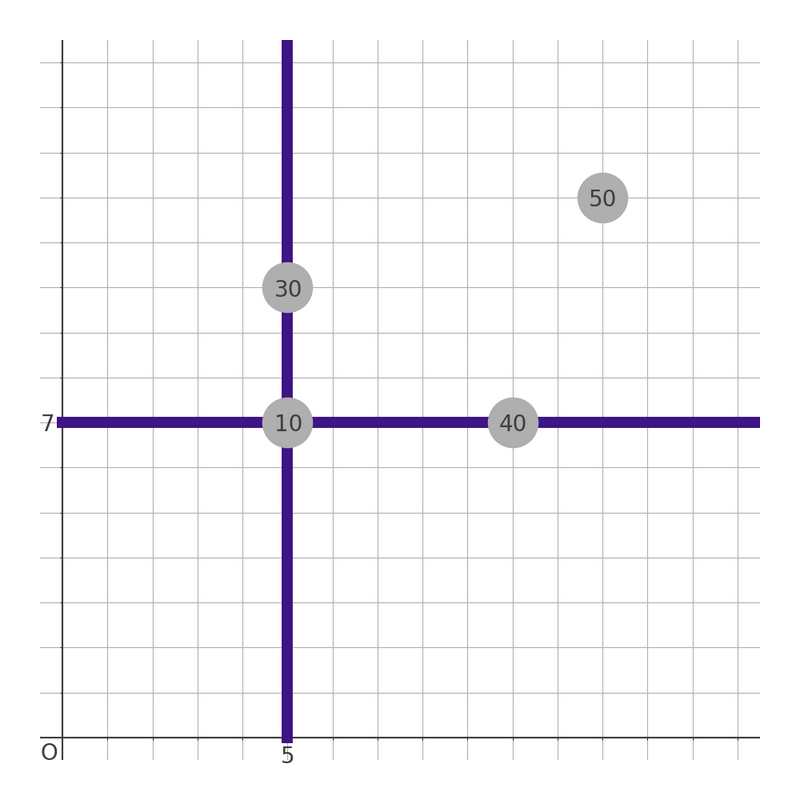 如果选择第 $3$ 个城市作为基点,则会沿直线 $x = 5, y = 7$ 建设地铁。此时,城市 $1$、城市 $3$、城市 $4$ 上居住的人口 $40 + 10 + 30 = 80$ 人都可以使用地铁,这就是最大值。