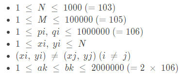 接下来 $m$ 行,第 $3+i$ 行分别为 $a,b,x,y$ 四个数组的第 $i$ 个的数