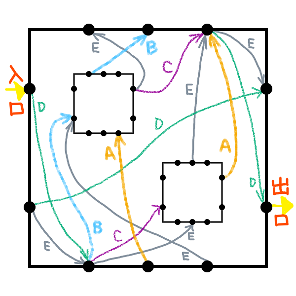 - 最も外側の入口の頂点から最も外側の出口の頂点へ (すなわち,図に直接示された入口から図に直接示された出口へ) 辿り着かなければならない.