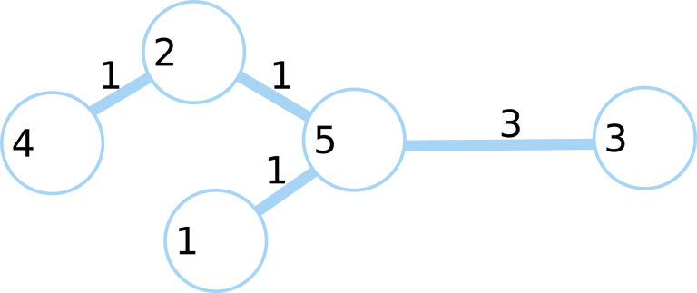 在第三个样例中,可以有一条鱼从湖泊 $1$ 游到湖泊 $5$,其余鱼在各自湖泊停留:湖泊 $4$ 有两条鱼,湖泊 $5$ 有六条鱼,湖泊 $3$ 有一条鱼。湖泊系统如图所示。
