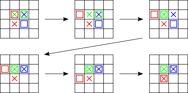 Vasya 通过了所有考试!出乎意料的是,Vasya 并不感到疲惫,反而已经准备好迎接新的挑战。然而,他并不想在难题上花费太多精力。 Vasya 想起了自己有一个不太难的谜题:在一个 $n \times n$ 的国际象棋棋盘上,放置着 $m$ 个有颜色的立方体。事实上,$m \leq n$,并且所有立方体的颜色都不同。每个立方体正好占据一个格子。此外,棋盘上为每个立方体都指定了一个目标格子,谜题的目标是将每个立方体移动到它的指定位置。立方体很脆弱,因此每次操作只能将一个立方体移动到它相邻的四个格子之一,并且目标格子必须是空的。Vasya 想要小心操作,因此每次操作恰好需要一秒钟。 Vasya 曾经为 VK Cup 决赛刻苦训练过,所以他最多能专注于这个谜题 $3$ 小时,也就是 $10800$ 秒。请帮助 Vasya 找到一组操作序列,使得所有立方体都被移动到它们的指定位置,并且 Vasya 不会失去注意力。