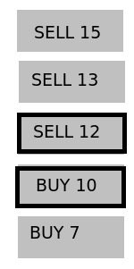 如图所示,某人以价格 $12$ 卖出产品,这是最优的 SELL 报价,因为另外两个 SELL 报价价格更高。最优的 BUY 报价价格为 $10$。