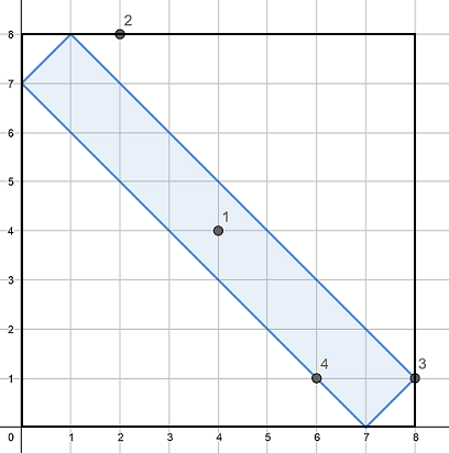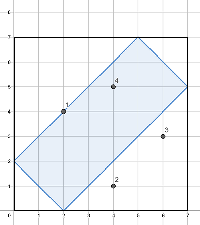 第一个样例中的玉米地如上图所示。第 $1$ 只蚂蚱(坐标为 $(2, 4)$)和第 $4$ 只蚂蚱(坐标为 $(4, 5)$)在玉米地内部。 第二个样例中的玉米地如图所示。第 $1$ 只蚂蚱(坐标为 $(4, 4)$)、第 $3$ 只蚂蚱(坐标为 $(8, 1)$)和第 $4$ 只蚂蚱(坐标为 $(6, 1)$)在玉米地内部。 ![](https://cdn.luogu.com.cn/upload/vjudge_pic/CF1030B/e5639eb53ffd6809c606315deea176befa06452d.png) 由 ChatGPT 4.1 翻译