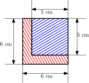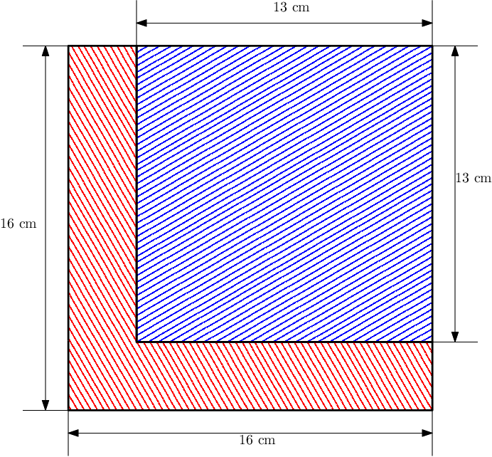 Alice 有一块漂亮的布料。它的形状是一个边长为 $a$ 厘米的正方形。Bob 也想要这样一块布料,他更喜欢边长为 $b$ 厘米的正方形(其中 $b < a$)。Alice 想让 Bob 开心,于是她从自己布料的一个角落裁下了所需的正方形送给了 Bob。现在她剩下了一块丑陋的“L”形布料(见下图)。