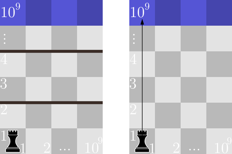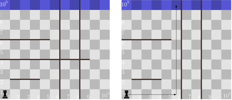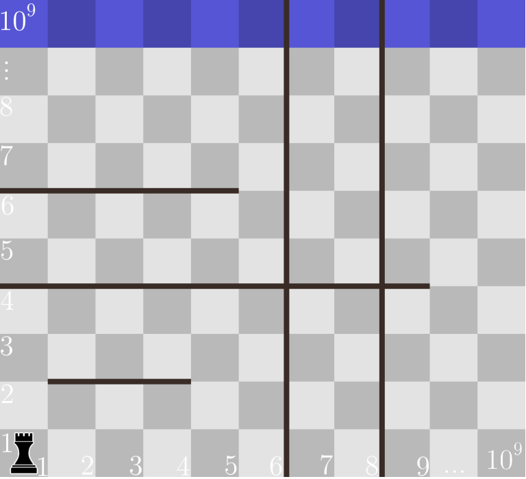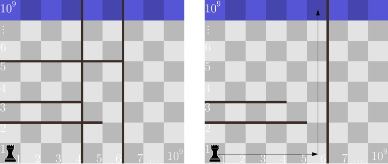 输出一个整数,表示车最少需要移除多少个魔法,才能从 $(1,1)$ 到达至少一个行号为 $10^9$ 的格子。