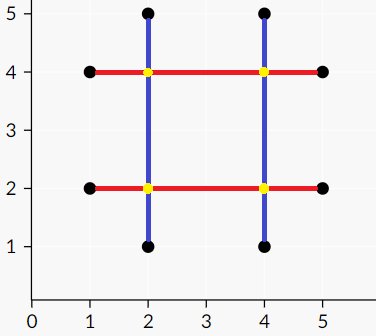 在第一个样例中,Pasha 可以组装如下的电路图: ![](https://cdn.luogu.com.cn/upload/vjudge_pic/CF1054F/6ba3833c65619ed5227733358afe3cc746b2ae33.png) 在这个电路图中,有 $2$ 根红色导线,分别连接 $(5, 2)$ 与 $(1, 2)$,以及 $(1, 4)$ 与 $(5, 4)$;有 $2$ 根蓝色导线,分别连接 $(2, 1)$ 与 $(2, 5)$,以及 $(4, 5)$ 与 $(4, 1)$。注意,火花只会出现在输入描述的那些点,在图中用黄色标出。例如,Pasha 会在 $(2, 4)$ 看到火花,因为第二根红色导线和第一根蓝色导线在此相交。可以证明,无法用少于 $4$ 根导线实现相同的火花分布。 由 ChatGPT 4.1 翻译