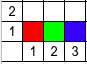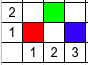 下图展示了所有三个样例的车的摆放方式(红色为颜色 $1$,绿色为颜色 $2$,蓝色为颜色 $3$)。