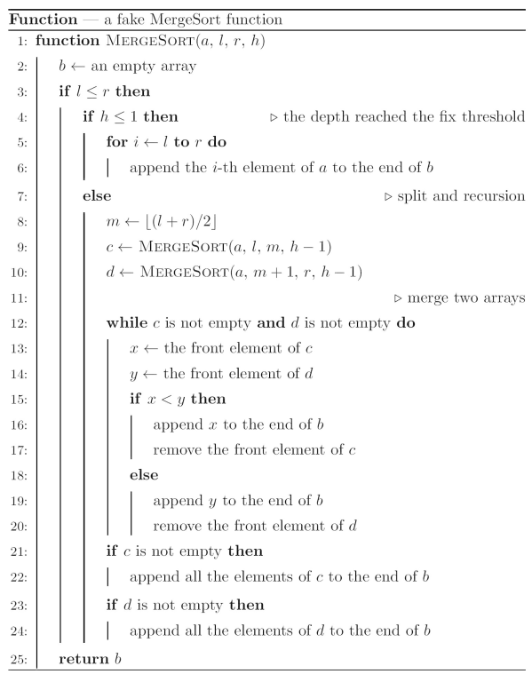 Chouti 回忆起他刚开始学习竞赛编程的日子。当时他刚学会写归并排序,觉得归并排序太慢了,于是他限制了递归的最大深度,并将归并排序修改成如下形式: