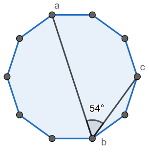 第一组询问的答案如上图所示。 第二组询问的答案是正 $18$ 边形。例如,$\angle{v_2 v_1 v_6} = 50^{\circ}$。 第三组询问的例子为 $\angle{v_{11} v_{10} v_{12}} = 2^{\circ}$。 第四组询问,最小可能的 $n$ 是 $180$(不是 $90$)。 由 ChatGPT 4.1 翻译