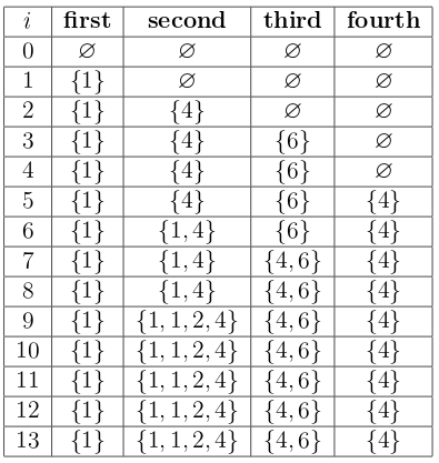 以下是示例测试中每次事件后多重集的状态;$i$ 表示已经处理的询问数量: