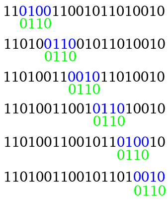Thorse-Radewoosh sequence in the first example is the standard Thue-Morse sequence, so the sequence $ A $ is as follows: $ 11010011001011010010 $ . Here are the places where the sequence $ B $ majorizes $ A $ :
