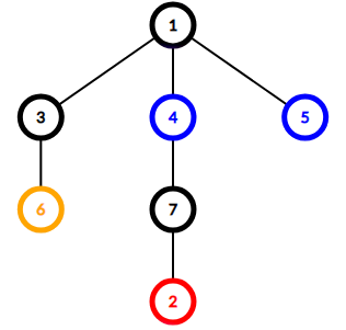 有些顶点被染成 $k$ 种颜色中的一种,有些顶点未染色。保证树中每种颜色至少有一个顶点。也可能没有未染色的顶点。