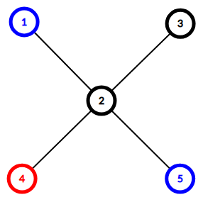 唯一的优美子集是边 $(2, 4)$。删除它后,树被分成 $\{4\}$ 和 $\{1, 2, 3, 5\}$ 两个连通分量。第一个分量只包含颜色 $1$ 的顶点,第二个分量只包含颜色 $2$ 及未染色的顶点。