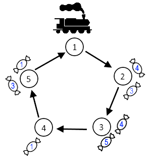 The blue numbers on the candies correspond to $ b_i $ values. The image corresponds to the $ 1 $ -st example.The train has infinite capacity, and it is possible to load off any number of candies at a station. However, only at most one candy can be loaded from a station onto the train before it leaves the station. You can choose any candy at this station. The time it takes to move the candies is negligible.