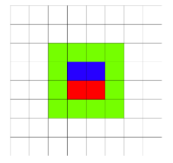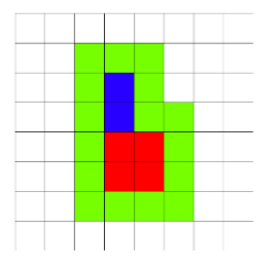 在第一个样例中,场地如下所示(红色为第一个矩形,蓝色为第二个矩形,绿色为被标记的格子):