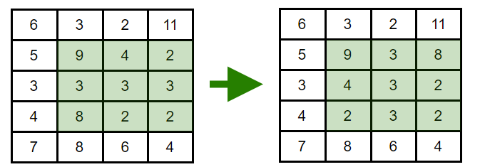 - 任选 $A$ 的任意一个正方形子矩阵,将其转置(即该子矩阵中原本位于第 $i$ 行第 $j$ 列的元素,在转置后会位于第 $j$ 行第 $i$ 列,且转置后的子矩阵仍保持在原来的位置)。