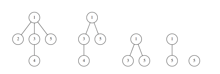 例如对于上图中的树,它的删除序列为:`2 4 3 1 5`。