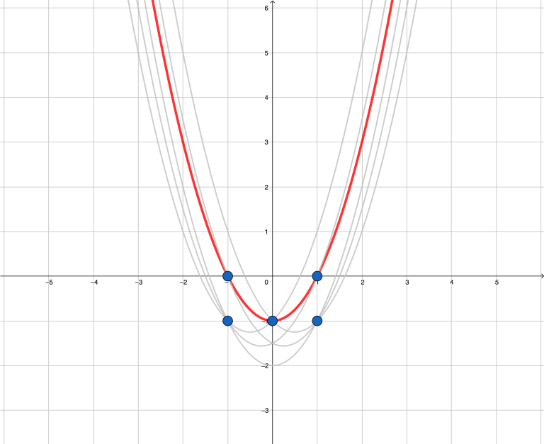 下图中展示了每个样例中所有经过至少两个给定点的 $U$ 形抛物线。没有任何给定点在其内部区域的 $U$ 形抛物线用红色表示。