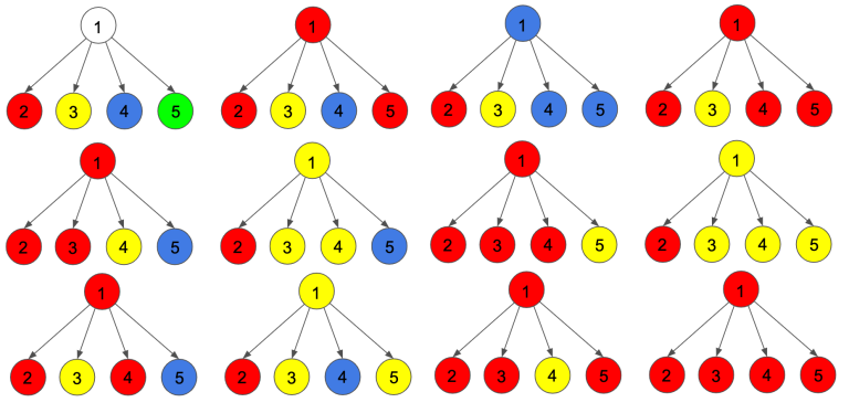 在第一个样例中,叶子节点为 $2,3,4,5$。划分叶子节点的方案如下图所示。