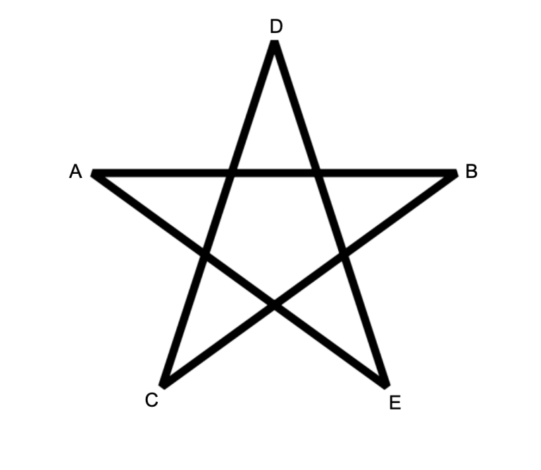 一个五角星是指从这 $n$ 个点中选出 $5$ 个点 $A,B,C,D,E$,并且可以按如下方式排列。 注意,线段的长度无关紧要,只要存在图中所示的特定交点即可。