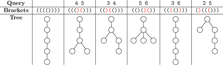 Owl Pacino 一直对树结构情有独钟——尤其是无权有根树。他喜欢为每棵树求直径——即树中任意简单路径的最大长度。 Owl Pacino 的猫头鹰朋友们决定送给他一台 Tree Generator™——这是一台能够根据描述生成有根树的强大机器。一棵 $n$ 个结点的有根树可以用长度为 $2(n-1)$ 的括号序列来描述,具体方式如下:找到一条从根结点出发并最终回到根结点的路径,要求每条边恰好经过两次——一次向下走,一次向上走。沿着这条路径,每当沿着一条边向下时,记下一个左括号“(”;每当沿着一条边向上时,记下一个右括号“)” 。 下图展示了样例有根树及其描述: ![](https://cdn.luogu.com.cn/upload/vjudge_pic/CF1149C/a9818ec6abf351ce6c6a0eaa115c2729c37577f5.png) Owl 写下了一棵 $n$ 个结点的有根树的描述。之后,他又写了 $q$ 次新的描述。每次写新描述时,他会从上一次写下的描述中选出两个不同的位置,交换这两个括号,并将结果写下来。他始终确保每次写下的字符串都能描述一棵有根树。 每次写下描述后,Pacino 都用 Tree Generator™ 生成对应的树。请你求出每次生成的树的直径。