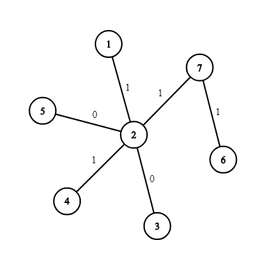 第一行包含一个整数 $n$($2 \le n \le 200000$),表示树的顶点数。 接下来 $n-1$ 行,每行包含三个整数 $x_i$、$y_i$ 和 $c_i$($1 \le x_i, y_i \le n$,$0 \le c_i \le 1$,$x_i \ne y_i$),表示一条连接顶点 $x_i$ 和 $y_i$ 的边,以及这条边上写的数字。 保证给定的边构成一棵树。
