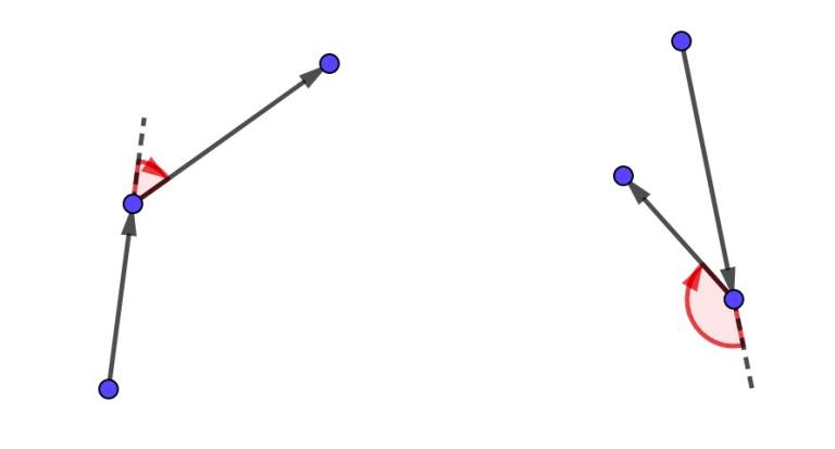 Vasya 有一个长度为 $n-2$ 的字符串 $s$,由字母 "L" 或 "R" 组成。我们称一条有向折线为“绕行”的,如果其第 $i$ 次转弯是左转当且仅当 $s_i = $ "L",右转当且仅当 $s_i = $ "R"。更正式地说:第 $i$ 次转弯发生在点 $A_{p_{i+1}}$,此时有向线段从 $A_{p_i}$ 到 $A_{p_{i+1}}$,再从 $A_{p_{i+1}}$ 到 $A_{p_{i+2}}$。设 $\overrightarrow{v_1} = \overrightarrow{A_{p_i}A_{p_{i+1}}}$,$\overrightarrow{v_2} = \overrightarrow{A_{p_{i+1}}A_{p_{i+2}}}$。如果将 $\overrightarrow{v_1}$ 逆时针旋转最小角度后与 $\overrightarrow{v_2}$ 方向一致,则称第 $i$ 次转弯为左转,否则为右转。为了更好地理解,请参考以下关于转弯的示意图: