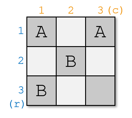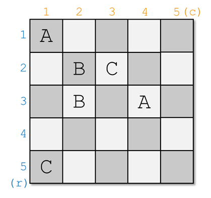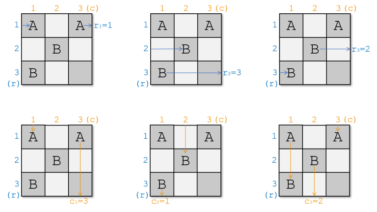 保证 $r_{1..n}$ 和 $c_{1..n}$ 都是 $n$ 的一个排列。$n$ 的一个排列是一个长度为 $n$ 的数列 $p_1,p_2,\ldots,p_n$,其中每个 $1$ 到 $n$ 的整数恰好出现一次。