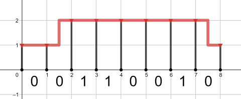You are responsible for installing a gas pipeline along a road. Let's consider the road (for simplicity) as a segment $ [0, n] $ on $ OX $ axis. The road can have several crossroads, but for simplicity, we'll denote each crossroad as an interval $ (x, x + 1) $ with integer $ x $ . So we can represent the road as a binary string consisting of $ n $ characters, where character 0 means that current interval doesn't contain a crossroad, and 1 means that there is a crossroad.