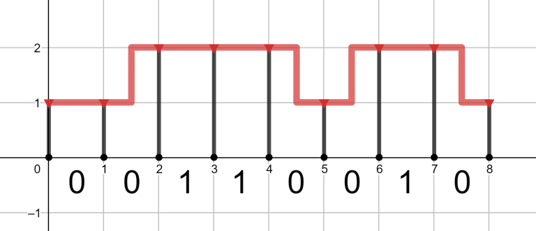 Note that you must start and finish the pipeline on height $ 1 $ and, also, it's guaranteed that the first and last characters of the input string are equal to 0.