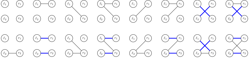 在第一个样例测试中,所有 $16$ 种图出现的概率相等。其中有 $7$ 种图存在完美匹配: