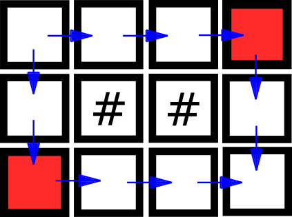 The following picture illustrates the island in the third example. Blue arrows show possible paths Vasya may use to go from $ (1, 1) $ to $ (n, m) $ . Red illustrates one possible set of cells for the Witch to turn into impassable forest to make Vasya's trip from $ (1, 1) $ to $ (n, m) $ impossible.